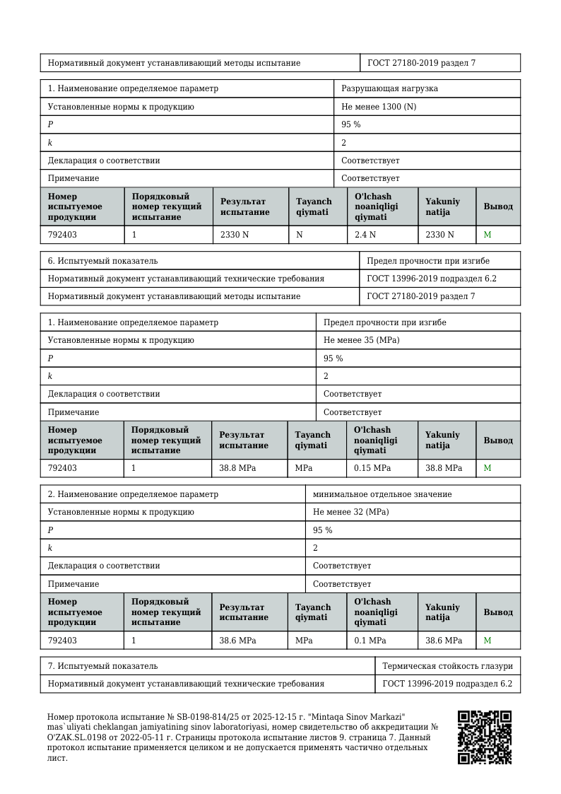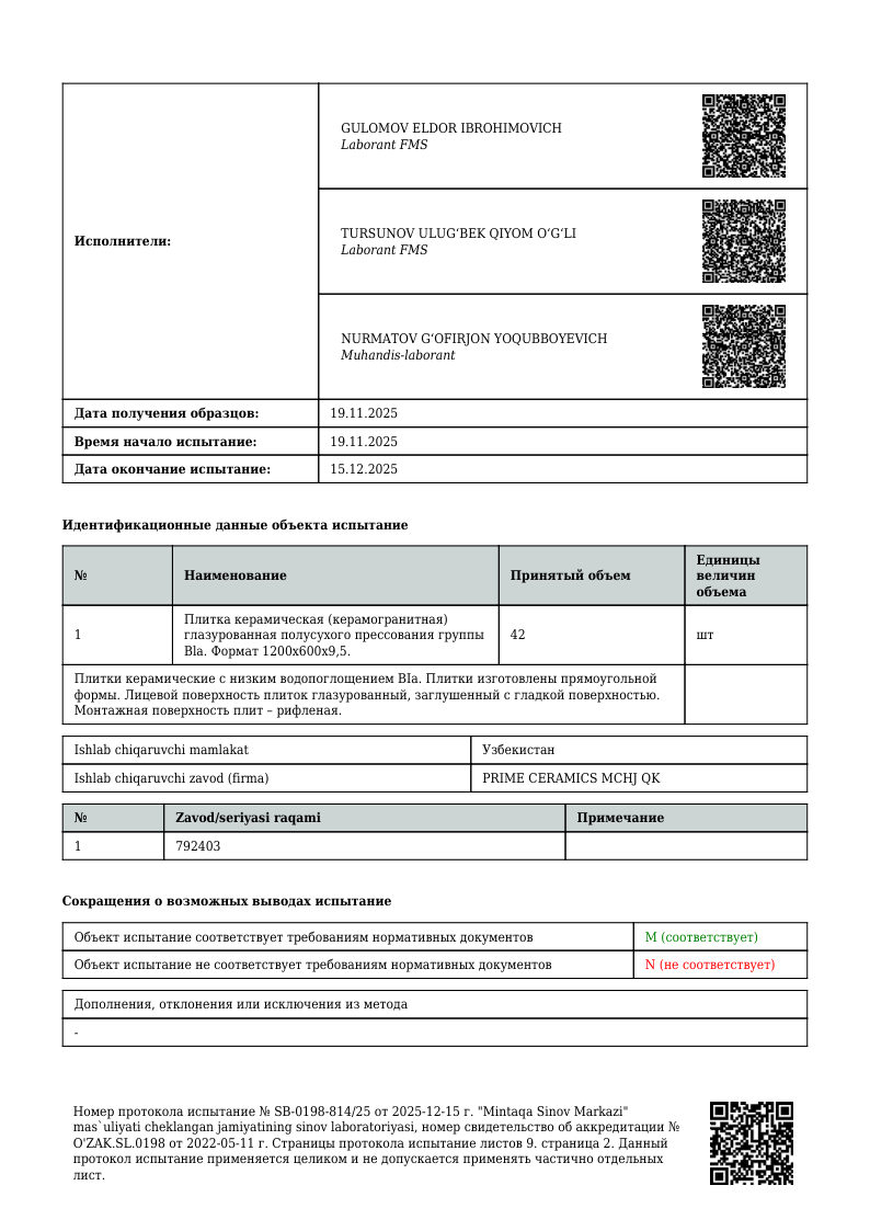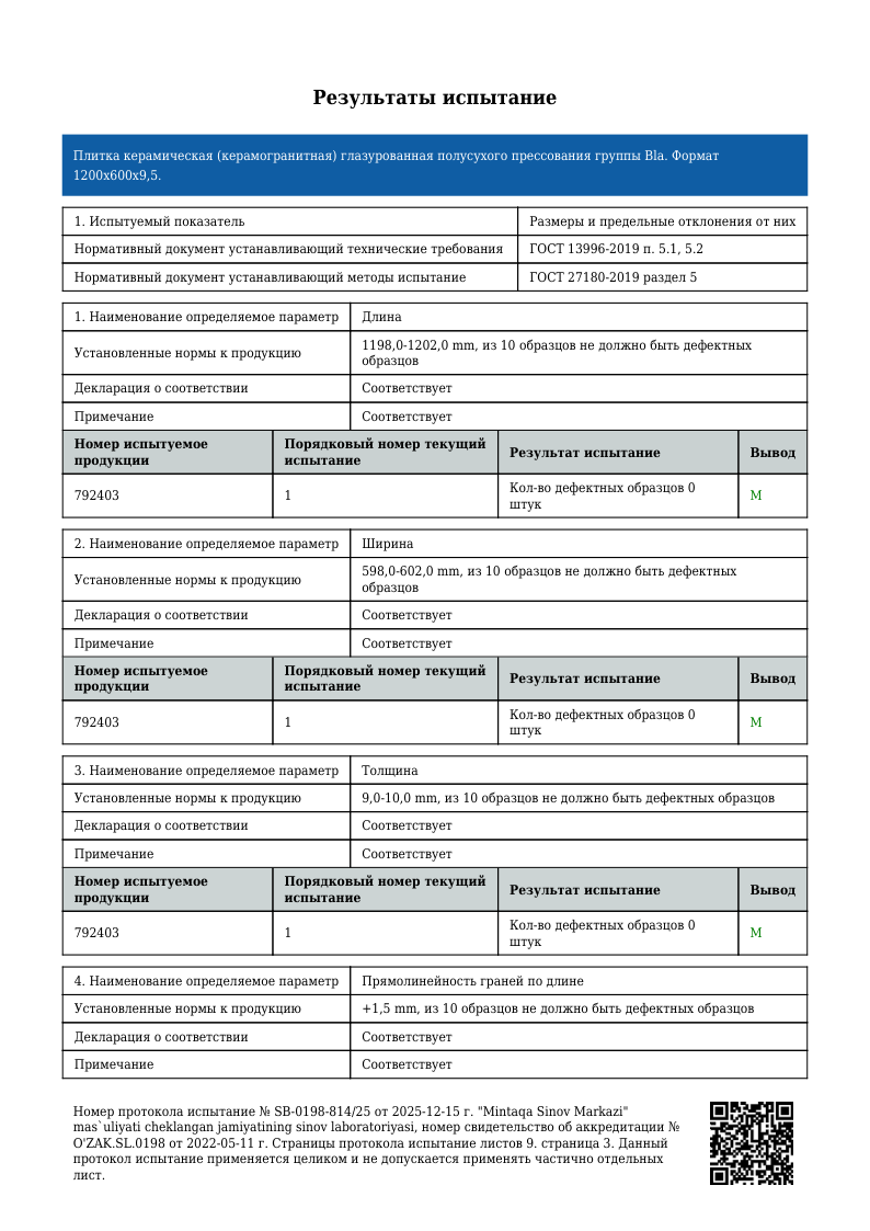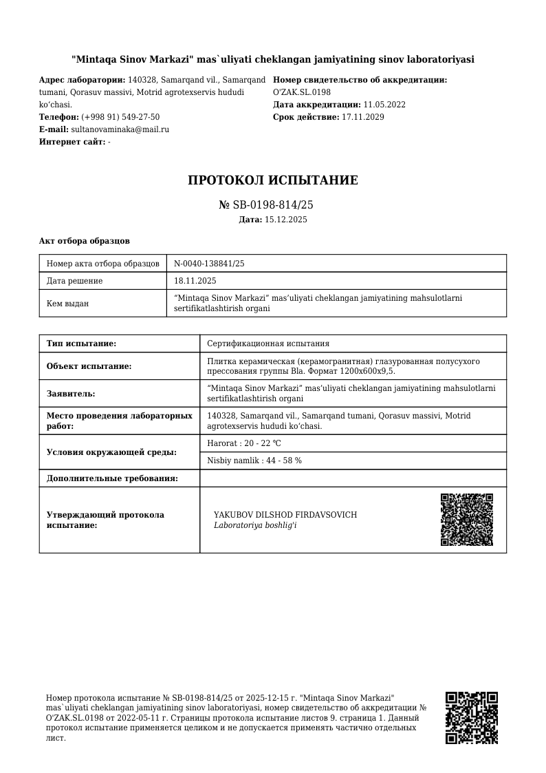 ПРОТОКОЛ ИСПЫТАНИЙ 1200х600 мм